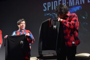 イベント前に本作を体験した2人。盛山は「せいやと違って初めてプレイした。スパイダースーツのツヤの感じ、昼と夜の移り変わり、水辺の表現、没入感、バトルシーンがすごかった。本当にスパイダーマンになったかのよう」と驚いた様子を見せる。前作をやりこんでいるせいやも「マップが拡大された。 映像の解像度がさらにすごい。オープニングの早い段階から出し惜しみなくスーパーヴィランが出てきて、つかまれます」と具体的なシーンやキャラクター名を出して熱弁した。