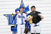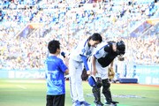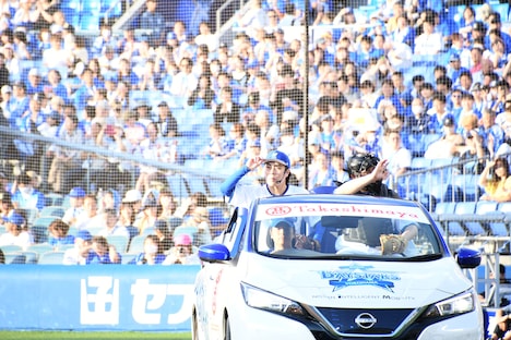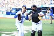 令和ロマンくるまはベイスターズファンとして知られ、このたびコンビで「交流戦SERIES 2024」の応援隊長に就任。くるまがユニフォームやグローブ、スパイクなど16万円、ケムリが硬式用、軟式用のキャッチャー防具など合計34万円の装備をそれぞれ購入し、万全の態勢でこの日を迎えた。リリーフカーに乗って元気よく登場した令和ロマンは、ピッチャーとキャッチャーが逆の位置につくというひとボケをかましたのち、速やかに定位置へ。声援も送られる中、くるまは緊張の面持ちで投球。お立ち台では、思うような球が行かなかったことに「暴投でもなく、中途半端ですみません!」と2人して頭を下げつつ、ベイスターズにエールを送った。