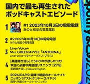 2023年10月にスタートした「あのと粗品の電電電話」は配信開始から1年でリスナー数80万人を獲得。また、Spotifyの再生数チャート(Podcast)で82日間にわたり1位を独占した。ランクインしたのは、#1(2023年10月3日配信回)と#2(2023年10月10日配信回)。なお、5位には「霜降り明星のオールナイトニッポン」(ニッポン放送)の2024年4月19日回もランクインした。