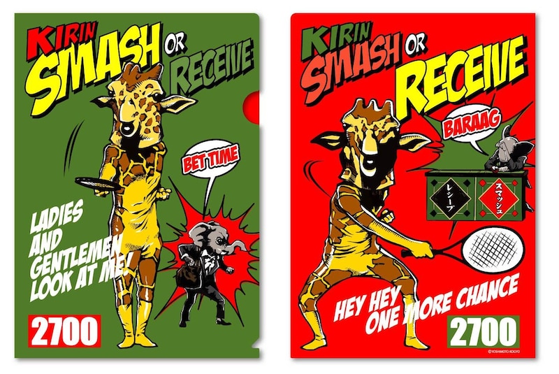 「2700 BOOKメモ」は踊るツネとピアノを弾いている様子の八十島の写真が満載。クリアファイルはアメコミテイストのイラストで、表にキリンスマッシュ、裏にキリンレシーブが描かれている。