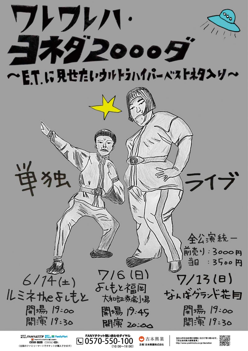 愛:ヨネダ2000単独ライブ開催が決定いたしました!! E.T.に見せたいウルトラハイパーベストネタ入り! E.T.に見せたいということはつまり、全世界の皆様に見てほしいということです! 全公演配信なし、会場のみとなっておりますのでぜひお越しください~!