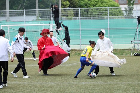 最初の対決相手は、一昨年のインターハイでベスト8に入った茨城・鹿島学園高等学校女子サッカー部。芸人チームは7人、強豪校チームは4人で試合に臨み、強豪校のゴールのほうが大きいというハンデも設けられる。試合が始まると、強豪校チームの素早い動きに芸人たちは「もう全員の体力がゼロです」と弱音モードに。そこで広範囲を守れる「クジャクキーパー」、ボールをスッポリ隠すことができる「貴婦人スカート」といったお助けアイテムが用意され、スカートを穿いた大悟は「入れていただいてよろしい?」「貴婦人が通ります」とノリノリで試合に臨む。