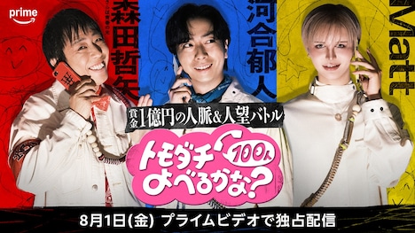 “さらば青春の光・森田、河合郁人、Mattの自称“芸能界最強の人脈”を持つ3人がプレイヤーとして出場。彼らの中で制限時間内に最も多くの友人を集めた人が1億円を手にできる”