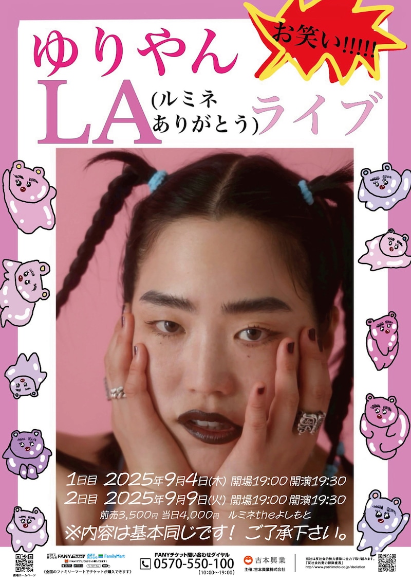 フライヤーには「お笑い!!!!!」という文字も添えられている同ライブ。ゆりやんがどのような笑いを届けるのか、気になる人は会場で確かめよう。チケットはFANYチケットで販売中。4日と9日の公演は同内容となる。