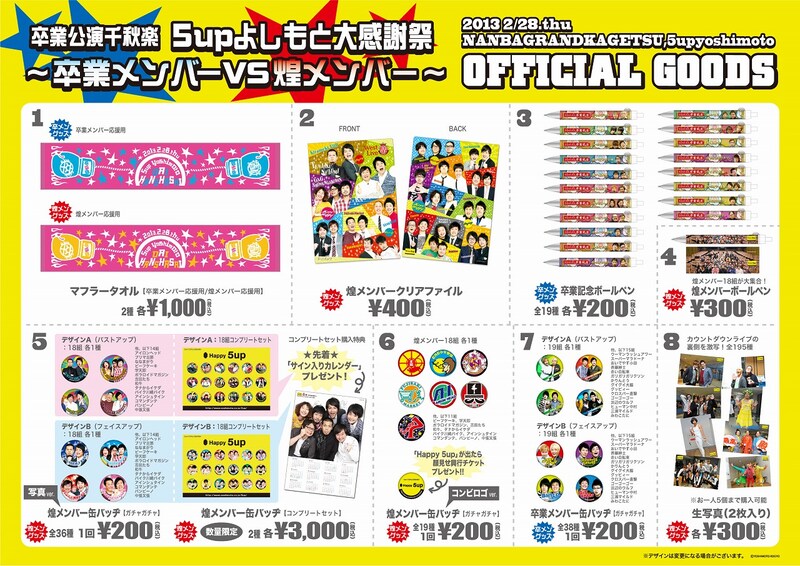 ボールペンは卒業メンバー19組それぞれと、煌メンバー18組集合の全20パターン。煌メンバークリアファイルには、18組の写真が表裏にわかれてプリントされている。缶バッヂガチャガチャは、卒業メンバーのフェイスアップバージョンとバストアップバージョンそれぞれ2種類ずつの計38種類。煌メンバーはフェイスアップバージョン、バストアップバージョン、コンビロゴバージョン以外に、顔見せ興行チケットが当たる「Happy 5up」が含まれている。さらに煌メンバーのフェイスアップバージョンとバストアップバージョンは、それぞれ数量限定のコンプリートセットを用意。セット購入者には先着でサイン入りカレンダーがプレゼントされる。