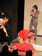 退場は対決ごとということで、さっそく最初の対決「ノーセンスサイコロトーク」へ。しかし、サイコロというおもちゃを渡してしまったばかりに、まったくトークに進まず。「ノーセンス即興ダジャレ」では、全員得意分野だけに、お題「角座」で「カドーザ川崎(ラゾーナ川崎)」「イトーヨーカドーザ」など次から次へとダジャレの連打。しかしコウタがほかの芸人が言った「カドザんペ(加トちゃんぺ)」をかぶせたところ、南川から「かぶせはハイセンス!」と、ノーセンス芸人らしくない高度な手法にしっかりNGを出した。その後は気が付いたら「ビールの銘柄を叫ぶだけ」「お題の“桜”がいつの間にか“古賀シュウ”になる」など、奇跡の混乱ぶり。この時点で30分しか経っていないことに気付いた南川は膝から崩れ落ちてしまった。