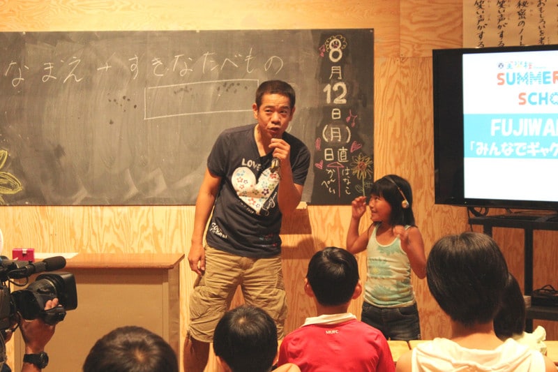 8月18日(日)まで、9月に開校する子供のための学校「笑楽校(しょうがっこう)」のオープニングイベントとして開催されている「笑楽校 presents SUMMER SMILE SCHOOL」。FUJUWARA原西による「ギャグ講座」に集まった40人の子供たちは、自己紹介ギャグやモノボケに挑戦した。
