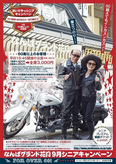 また、9月2日(月)から30日(月)まで、島田と末成由美がキャラクターを務める「シニアキャンペーン」を開催。60歳以上の人は、期間中の平日15時45分開演の本公演を前売・当日共に3000円で鑑賞することができる。また、同期間中、同じく平日15時45分開演の本公演にて、1日1組限定(2~5名)で、シニアプレミアム観劇チケットを販売。同チケットには、バックステージツアーなどの多数特典がついている。詳しくは、なんばグランド花月オフィシャルサイトにて確認を。