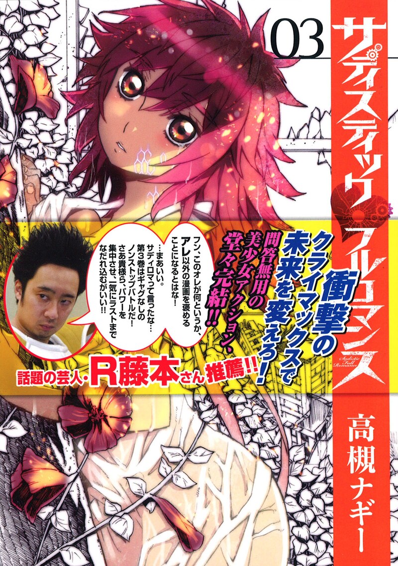 「サディスティックフルロマンス」は、極秘の暗殺任務を帯びて過去へとやってきた未来人の少女ハラキ・リスカと、その任務に巻き込まれる高校生・田中@太郎(アタロウ)の出会いから始まるSFコメディ。R藤本は「アレ以外の漫画を褒めることになるとはな!」と粗暴な前置きをしたあと、「第3巻はギャグなしのノンストップバトルだ!」と見どころを解説している。