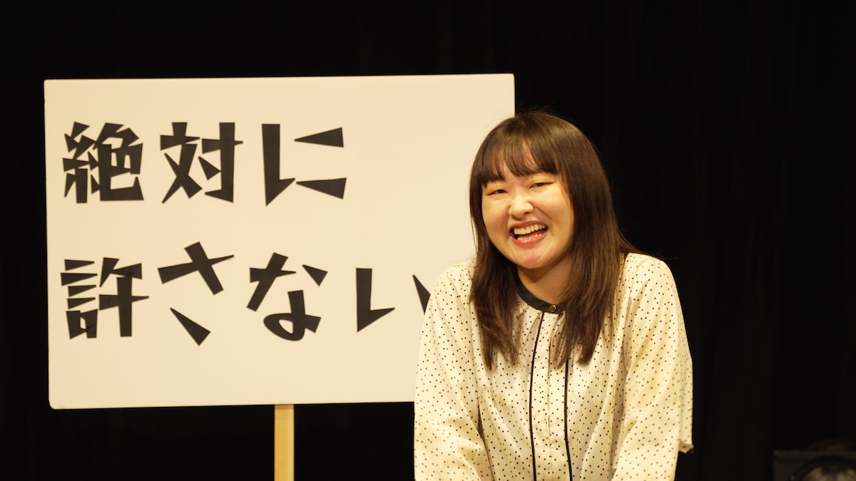 これは内容が二転三転しました。バイトの初日にすごく親切に仕事内容とかを教えてくれる人っているじゃないですか? でも「今日、私はこの時間で上がりだからあとはがんばってね」と声をかけてくれた先輩が、帰る準備をして私服で戻ってきたときにデモのプラカードを持っていたらマジで嫌だなと思ったりとか。あと、前に住んでいた家の近所にすごく素敵なお花屋さんがあって、気になって入ってみたいけどおしゃれすぎて入るのを戸惑っていたんですね。そんなときに初めて店の裏側に回ってみたら、めちゃくちゃ選挙のポスターが貼ってあったんですよ。「キツいなあ。思想が強い人は、なんか嫌だなあ」と思って。そこから「一番思想が強い人が来たら嫌な場面ってなんだろう?」と思って考えたネタが「結婚の挨拶」です。