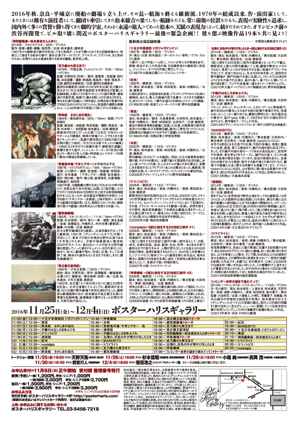 渋谷・ポスターハリスギャラリー最後の緊急企画、松本雄吉偲ぶ19作品を上映(画像ギャラリー 2/2) 前へ 次へ 松本雄吉追悼特集上映チラシ裏 [記事に戻る] 前へ 次へ この画像のタグ 松本雄吉 この記事の画像(全2件) × 93 この記事に関するナタリー公式アカウントの投稿が、SNS上でシェア / いいねされた数の合計です。 43 47 3 シェア 記事へのコメント(5件) 読者の反応 93 5 映画保存協会 FPS @filmpres 渋谷・ポスターハリスギャラリー最後の緊急企画、松本雄吉偲ぶ19作品を上映 - ステージナタリー https://t.co/TYjd8cQN6X「会場となるポスターハリスギャラリーは、ビル取り壊しにより移転を予定」 コメントを読む(5件)