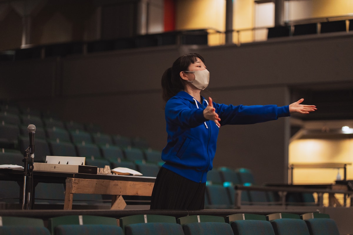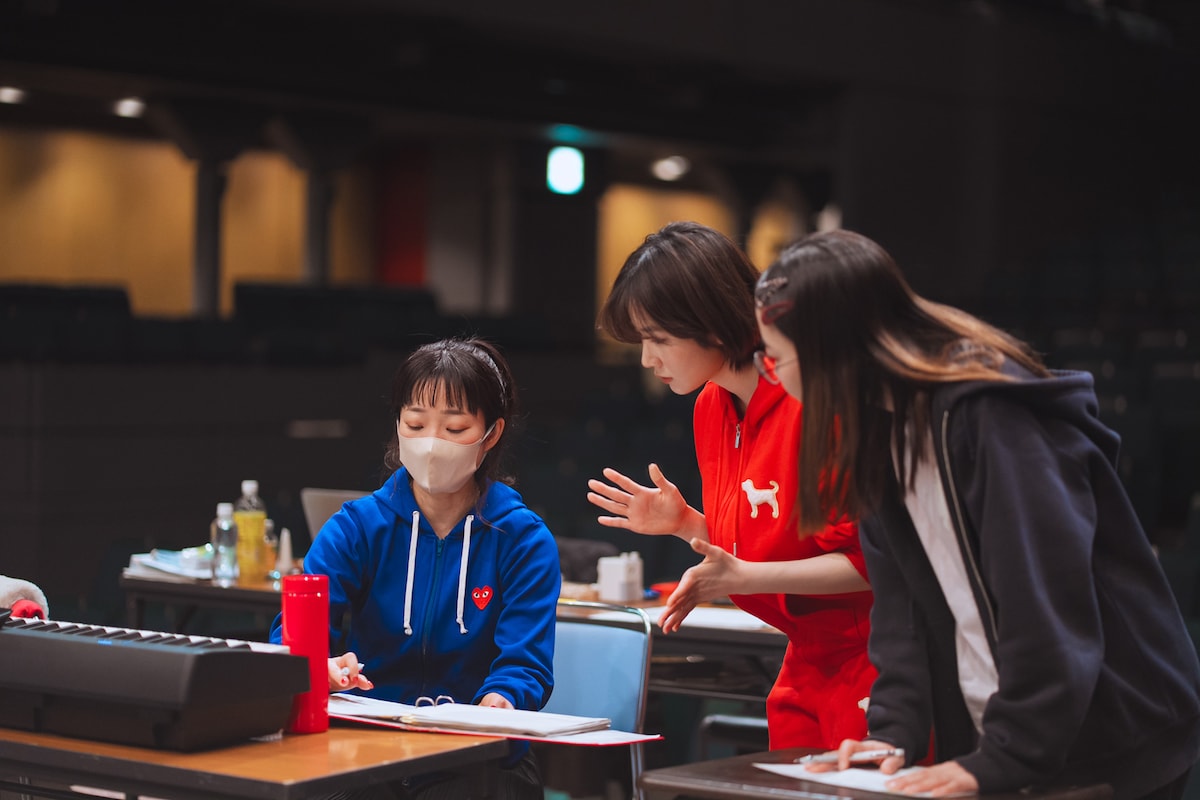 初演時、脚本と演出の良さはもちろん、音楽や振付の面白さも注目を集めた「アンサンブルデイズ」。杉田が作り出す音楽はメロディアスで美しく、観客として聴く分にはとても心地よいが、非常に繊細な音の連なりでできているので、歌うのは非常に難しそう。低音から急に高音に上がるところで苦戦していたCAS生に「もうちょっと早く、ここまで音を上げてほしい」「今のはちょっと早すぎるかな、でも心意気はいいよ!」と蔵田と杉田はかわるがわる声をかけ、CAS生たちに歌のポイントを叩き込んでいった。