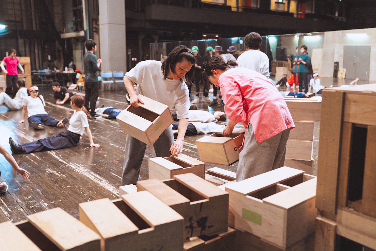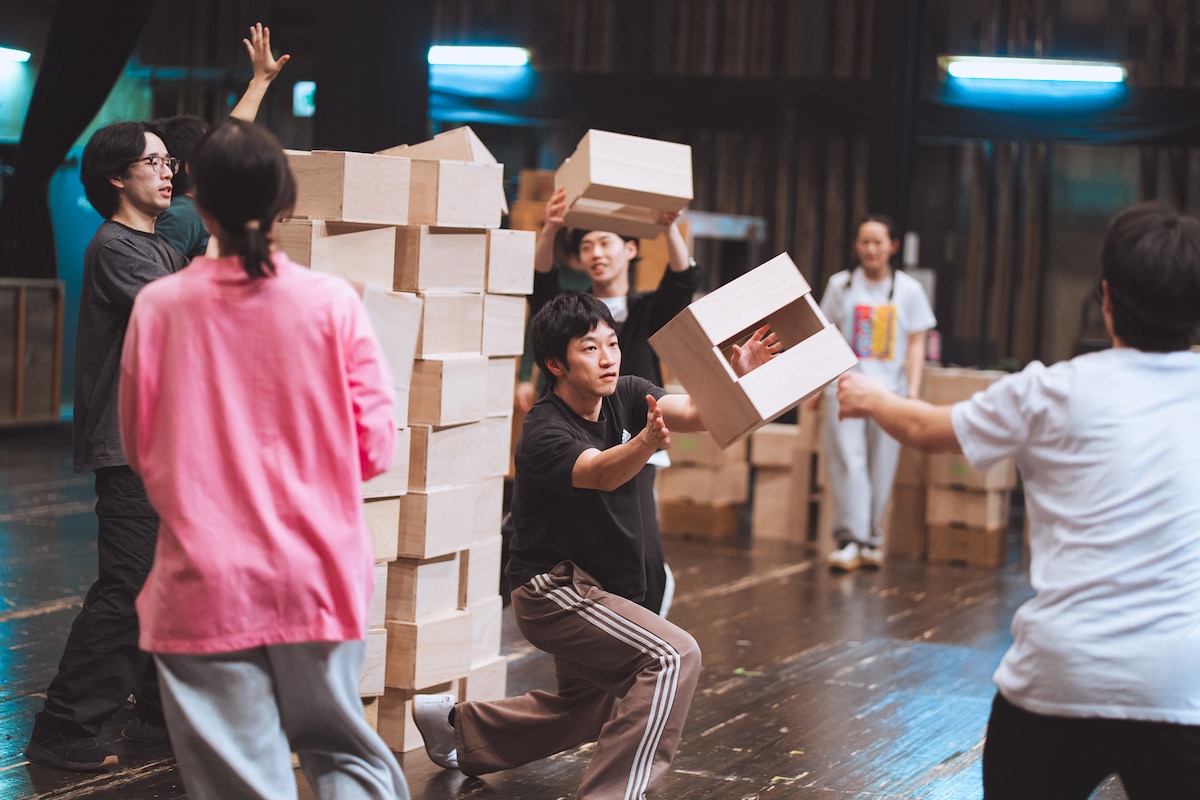 続けて箱馬を使ったダイナミックな動きへ。……が、よく見るとこの稽古場、箱馬が多すぎるのでは? しかも使い込まれた箱馬もあるけれど、まだ木の香りがしそうな、真新しい箱馬も多い……そう思ったちょうどそのとき、ノゾエがスッと隣に来て「ちょいネタバレなので知らずに観たい人はご注意ですが、今回舞台美術は、舞台資材界のアンサンブルリーダー的な箱馬を舞台美術の主役として使おうと思っているんです。ただちょっと足りなかったので、追加で作ってもらいました。追加で……“100個くらい”(笑)」と教えてくれた。