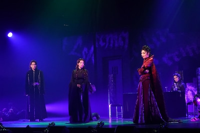 また、松井るみが担当した舞台装置では、ステージ上にぐるぐると回る筒状の重々しい回廊が出現。城壁のようにも見える回廊には、窓や階段、出ハケ口が設けられ、回る装置の中でキャストが次々と登場しては消えていく。その様子は、亡霊や記憶の中に生きる人物、イザボーを悩ませる外野・民衆の声を効果的に描くだけでなく、回りながら舞台正面に現れたキャストが一節ずつ歌いつなぐ演出にも一役買った。さらに、前田文子が手がける衣裳は黒を基調とし、ゴシックでダークな世界観を作り上げる。黒い装置に黒い衣裳、末満が得意とする闇に溶け込むような“黒い世界”は、話が進むにつれ、イザボーが身にまとう“赤”を効果的に引き立たせることになる。