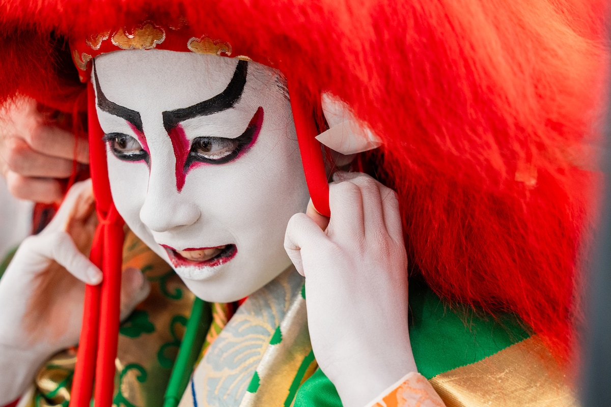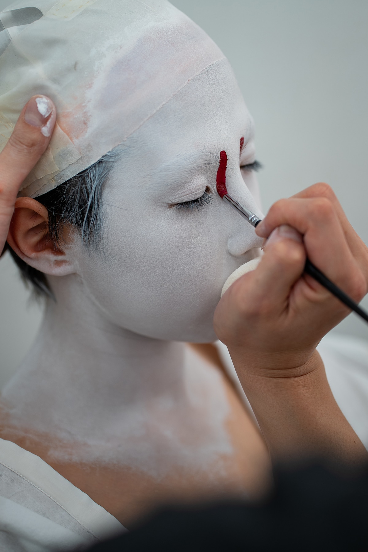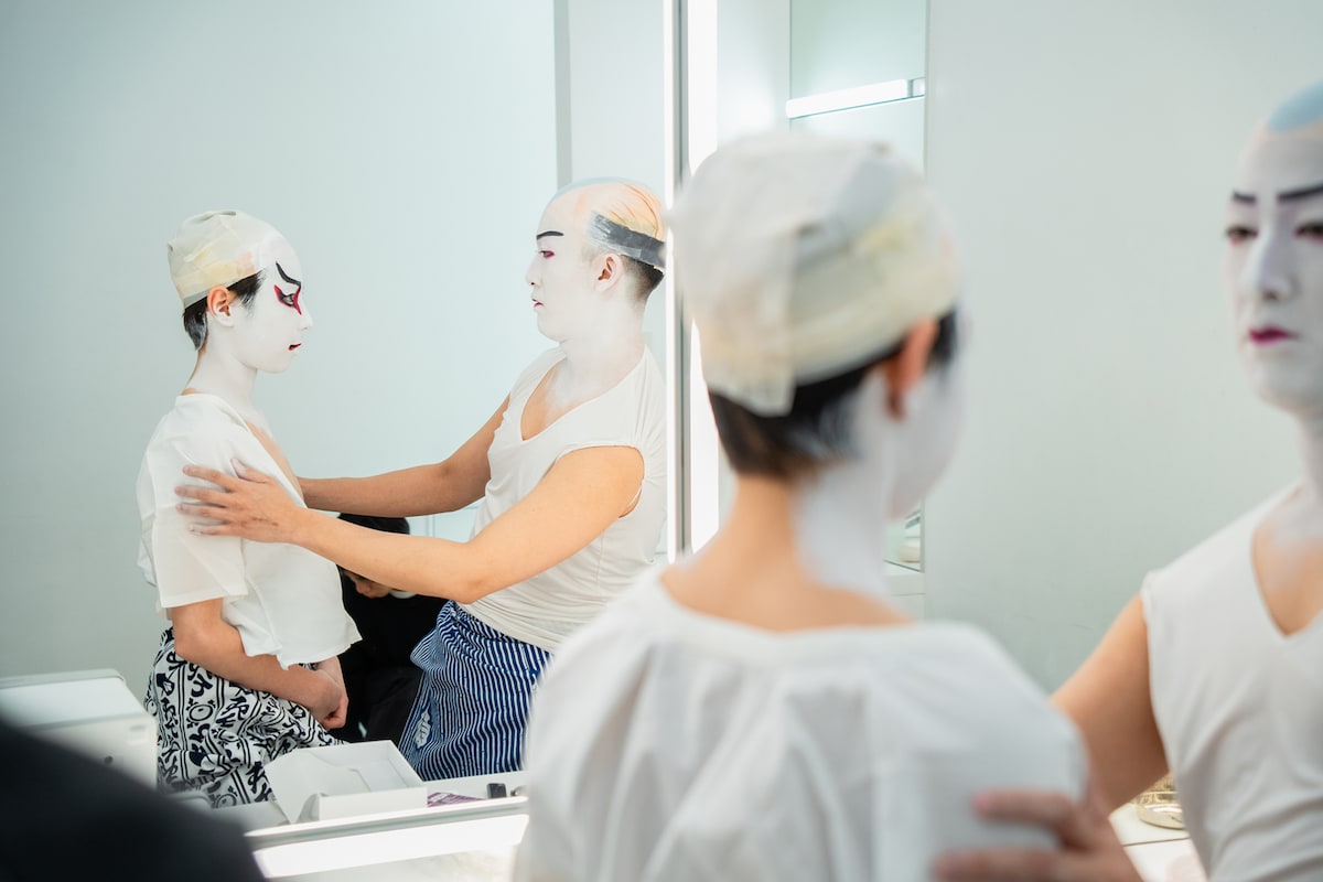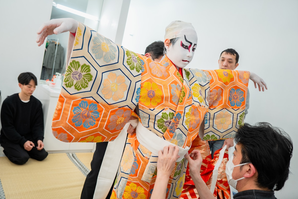 控室をのぞくとラップをBGMに(選曲はDJ眞秀担当)、2人そろって鏡の前に並び、仲良く化粧を開始したところ。13歳の眞秀は尾上菊史郎(※七代目尾上菊五郎門下)に化粧をしてもらっている。この日頼もしい助っ人として入る、尾上菊三呂(※同)も忙しそうに立ち働く。床山さんによると「眞秀さんが仔獅子をなさった『研の會』(2024年)よりもだいぶ背が伸びたので、前回と比べて毛の長さもギリギリになってきました」とのこと。この年代の成長は著しい。