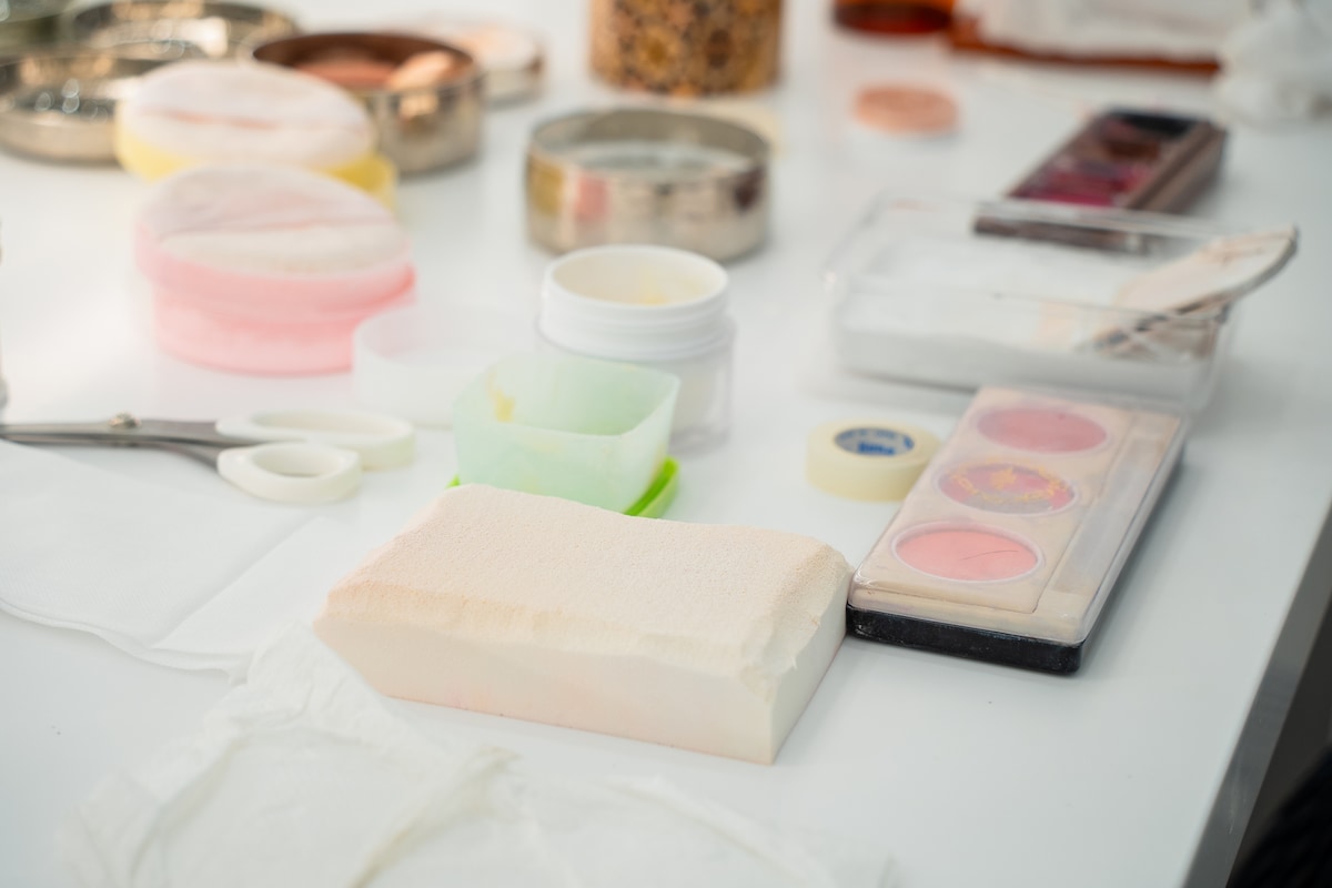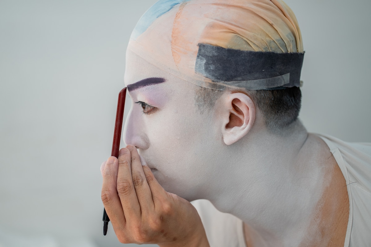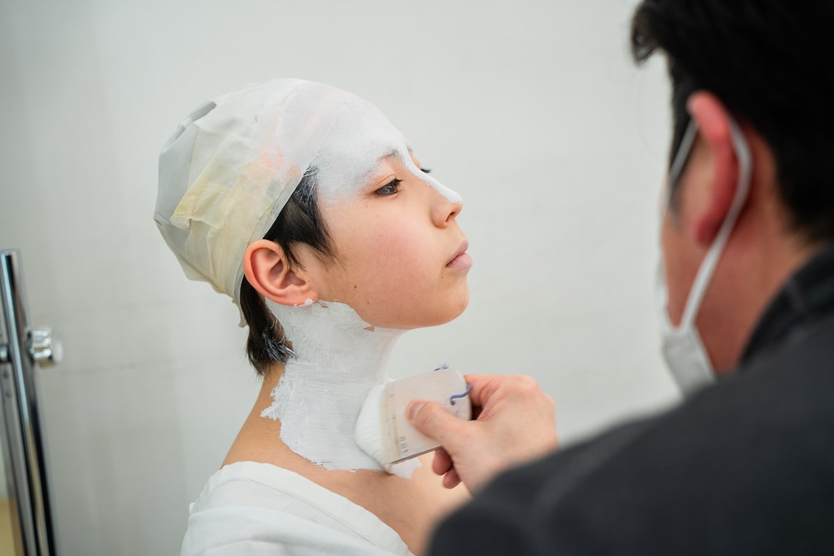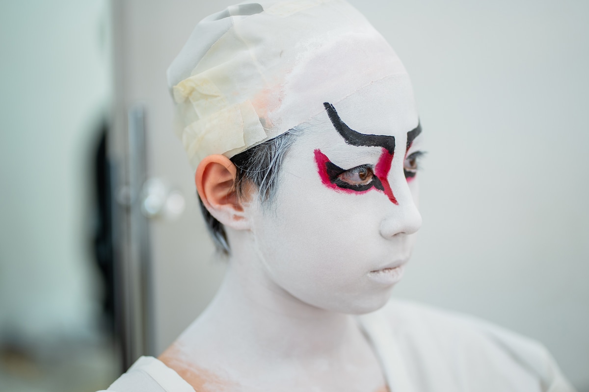 控室をのぞくとラップをBGMに(選曲はDJ眞秀担当)、2人そろって鏡の前に並び、仲良く化粧を開始したところ。13歳の眞秀は尾上菊史郎(※七代目尾上菊五郎門下)に化粧をしてもらっている。この日頼もしい助っ人として入る、尾上菊三呂(※同)も忙しそうに立ち働く。床山さんによると「眞秀さんが仔獅子をなさった『研の會』(2024年)よりもだいぶ背が伸びたので、前回と比べて毛の長さもギリギリになってきました」とのこと。この年代の成長は著しい。