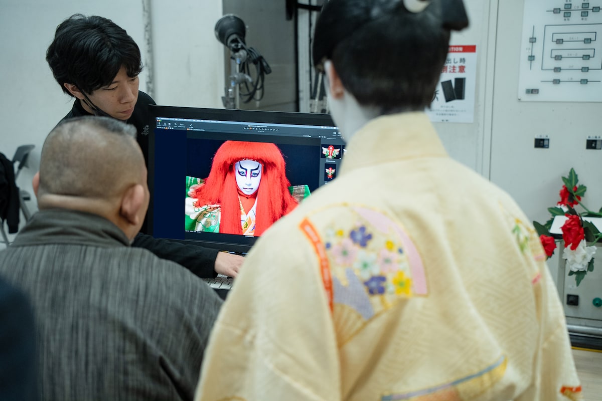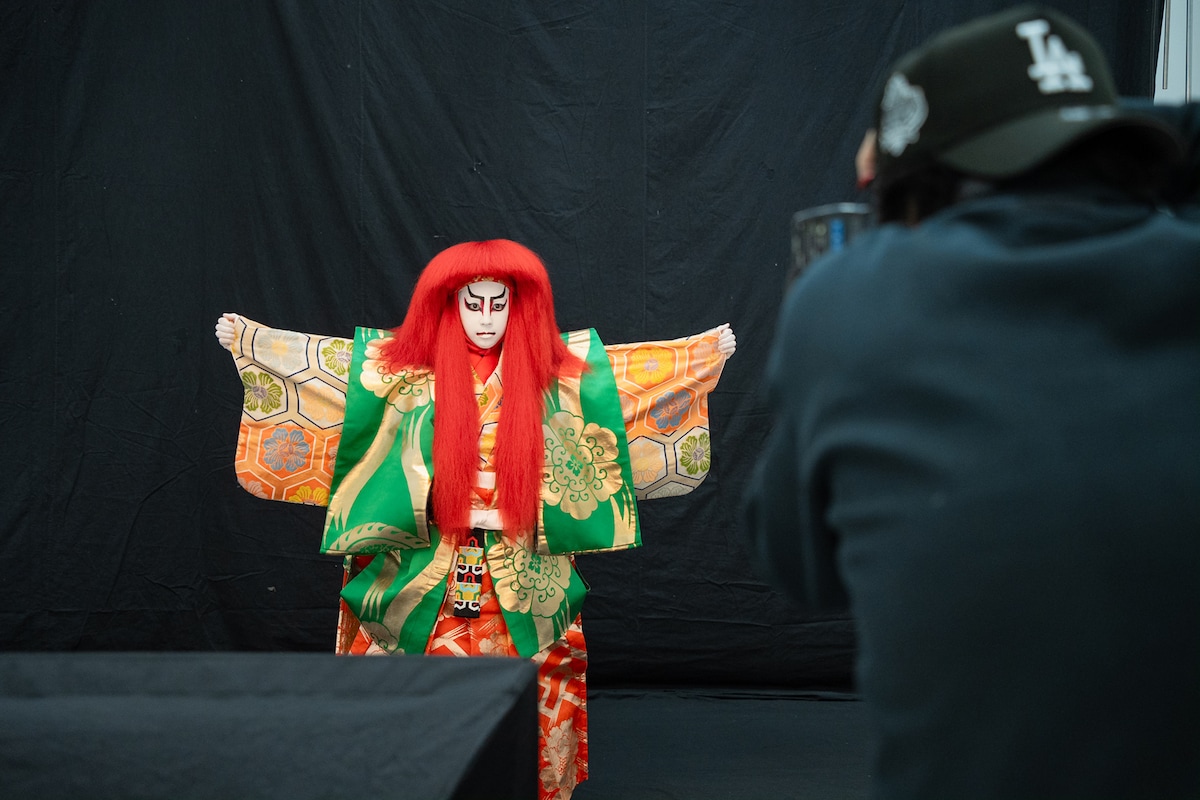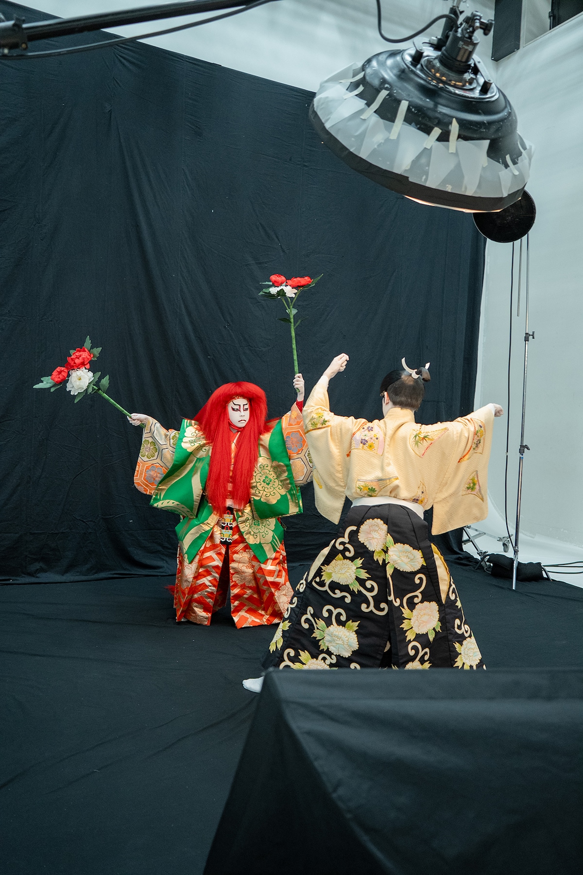 宣伝ビジュアル撮影は本番通りの拵えだけに、スタジオにはさまざまな裏方さんが続々と到着。こうした撮影は衣裳や鬘や小道具のチェックの場でもあり、技術や伝統が継がれていく貴重な機会でもあるのだろう。