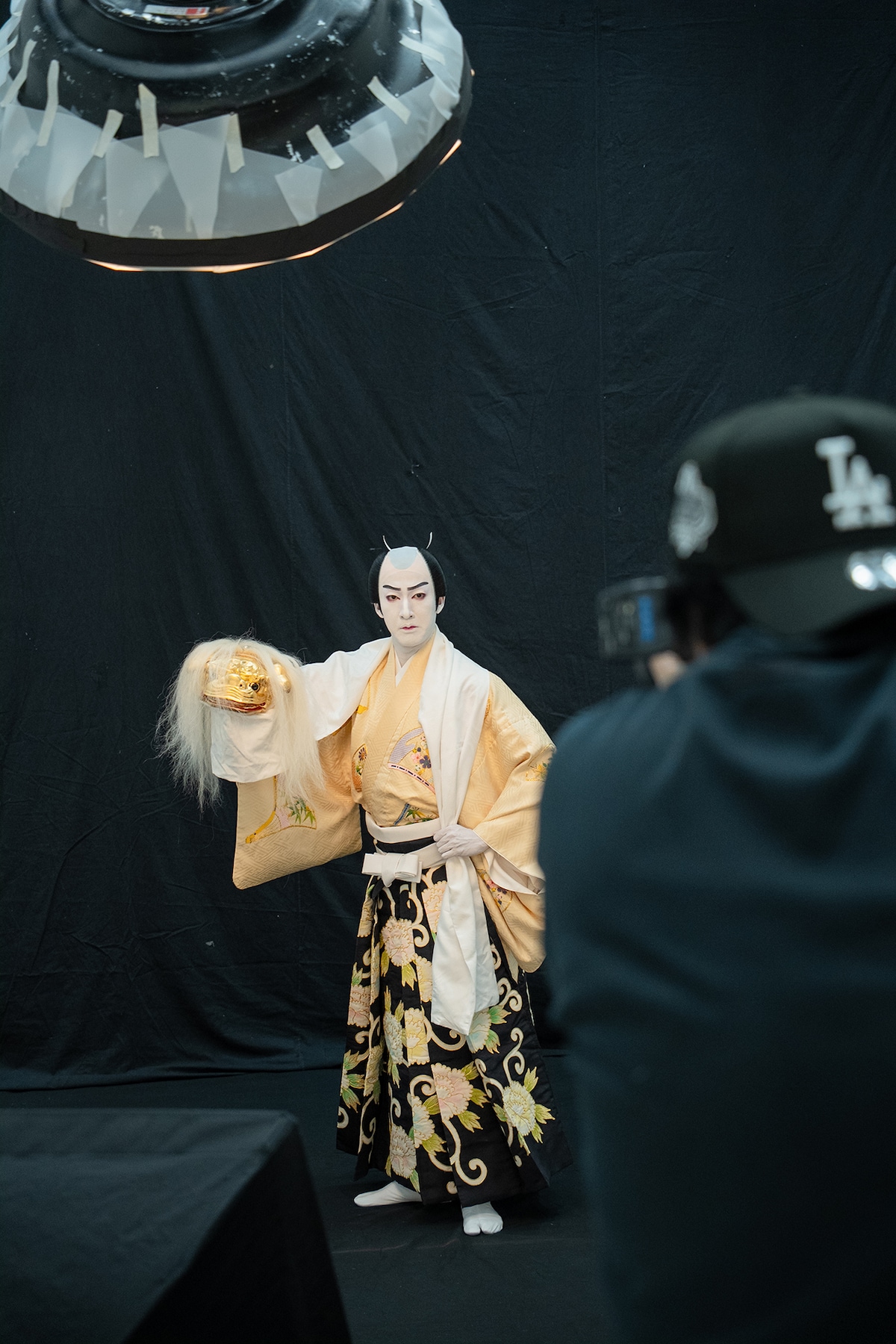 その後もツーショットでさまざまなポーズをおさえ、いよいよ眞秀が毛振りをするときがやってきた。舞台と違ってカメラマンと息を合わせる技術が重要となる。右近が「きたきた~」「できてる!」と励ましながらアドバイスするたびに、どんどん上達していく眞秀。会心の一撃が出るとそこにいた全員から大拍手がわきおこる。獅子の鬘は頭にぎゅっと締め付けてあるので、長時間になってくるとかなりキツくなるそう。だが弱音も吐かずに見事に頑張った。ここで眞秀の撮影は終了。最後は右近のソロショット。さすが、どんなポーズも様になっており、全てがシャッターチャンスだ。撮影が終わると全員でモニターを確認。どのカットも大迫力で力強く、生き生きと躍動していた。