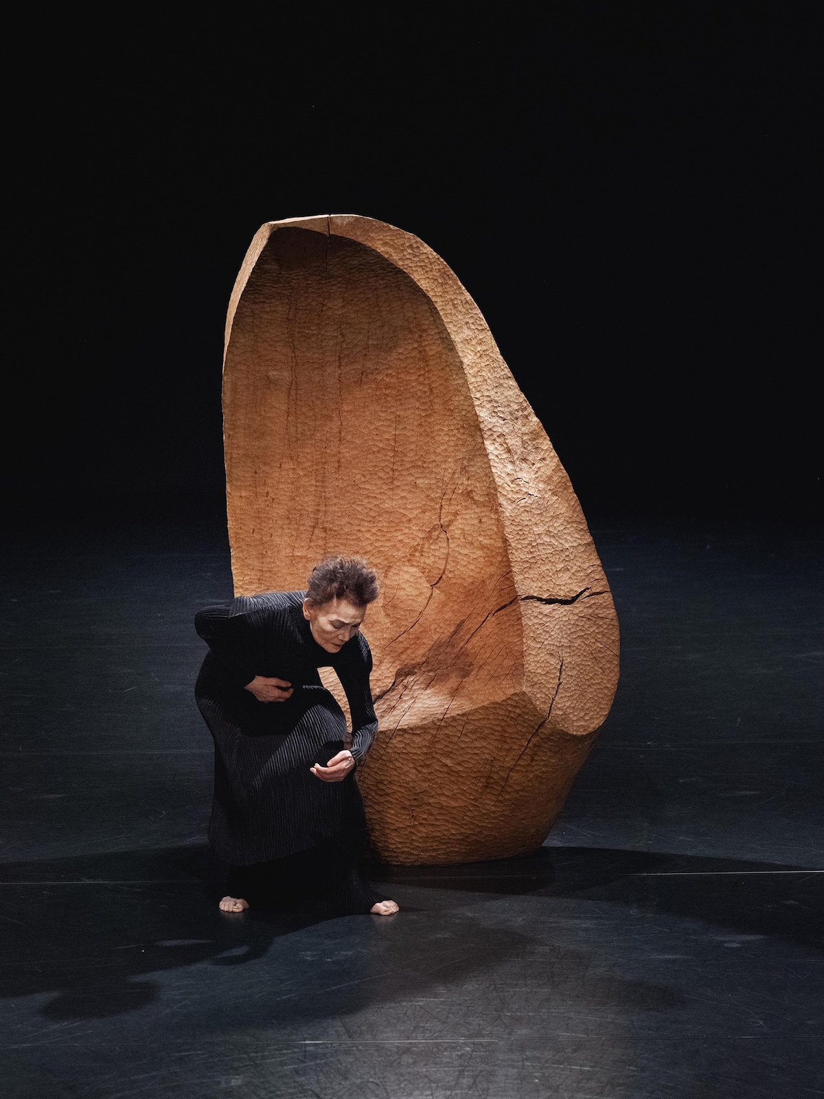 開演とともに舞台が暗転し、《神の舌》にスポットライトが当たったとき、客席の観客は息を呑んだ。ナラ材から削り出された203×120センチの巨大な塊は、美術館のフラットな空間とは異なる、舞台の照明のなかで特別な存在感を放っていた。木の肌理が浮かび上がり、ビッキが刃を入れたひとつひとつの切削痕が、まるで皮膚のような質感を帯びている。聖なるものを表象する巨木から彫り出された彫刻──それ自体がすでにひとつの「身体」として、舞台空間を支配していた。