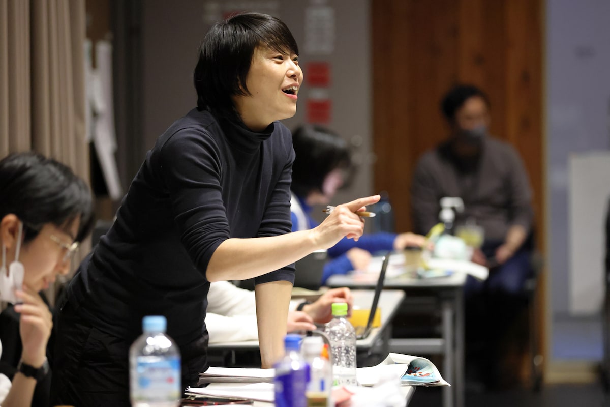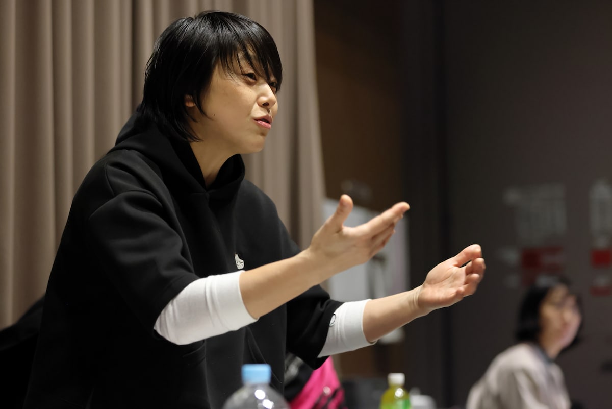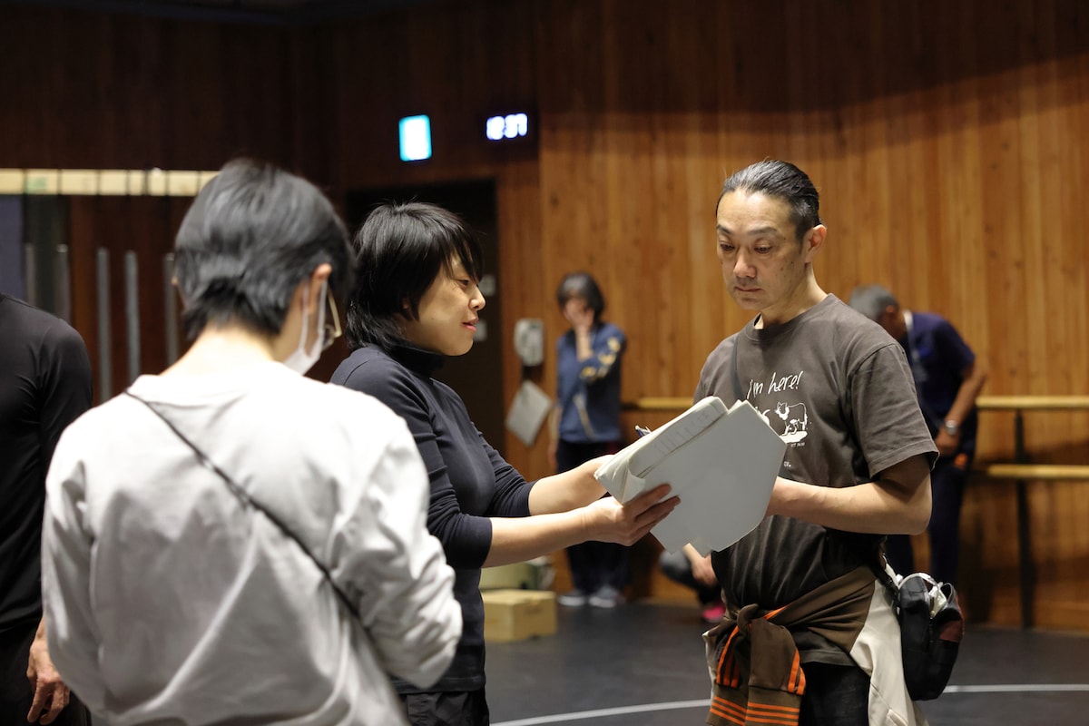 印象的だったのは、演出助手の山田がシーンの説明を始めようとしたときのこと。ちょうど同じタイミングで、キャスト2人がある動きの確認でやり取りを始めたところ、山田と樋口は2人の話を遮らず、2人が話し終わるのを待って説明を始めた。また、浜の人たちが一斉に動くシーンでは、全員に同じ動きを求めるのではなく、それぞれのキャストが自分でできる動きを決めるまで、樋口は細やかに声をかけ続けた。稽古の時間は限られているけれど、ゆったりとした時間が流れているように感じたのは、樋口をはじめクリエーターたちが作り出す、心地よさにあるのだろう。