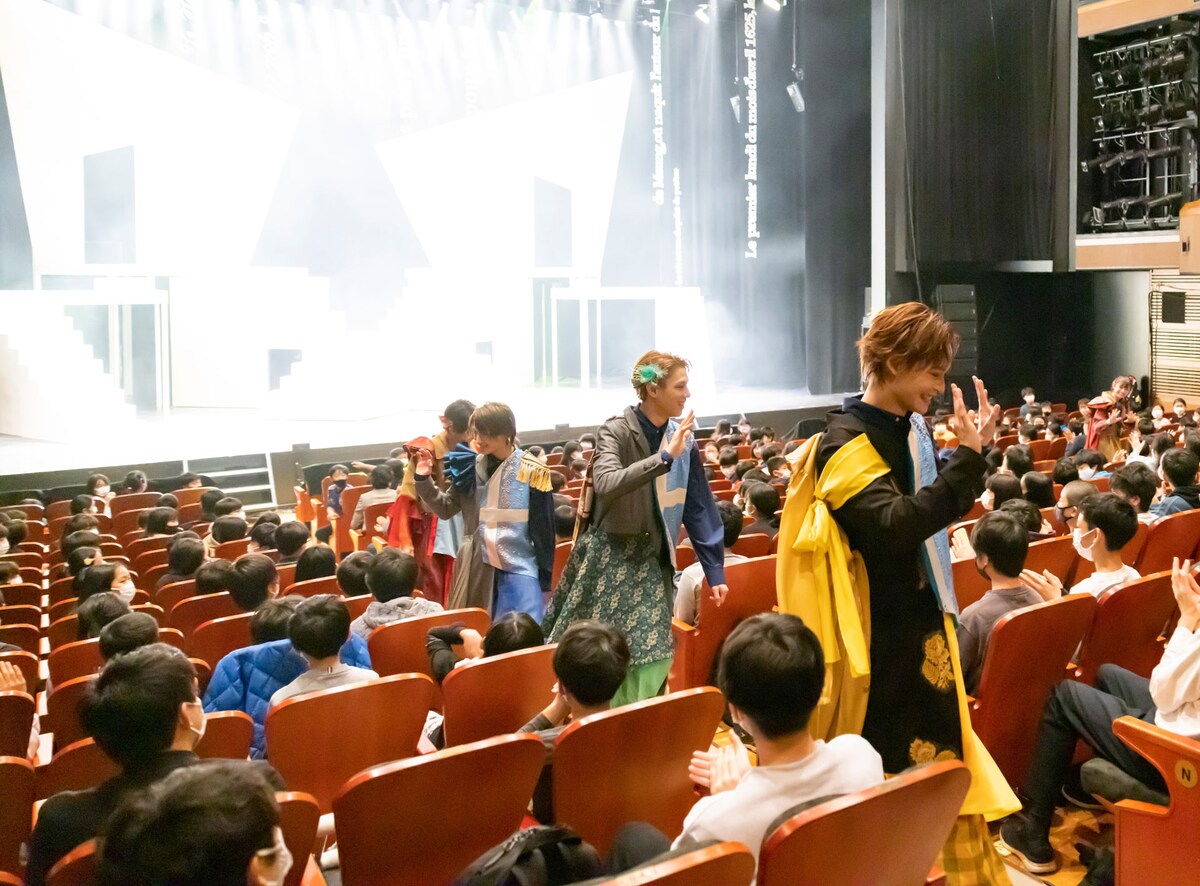 その後、キャスト一同が再び舞台上に姿を現し、記念撮影へ。リシュリュー枢機卿としてヒール役を担った郷本直也が、劇中とはうって変わって柔らかな表情で、「みんな、おじさんは本当は怖くないからね!? 良い人だからね!?(笑)」とアピールすると、児童たちは笑い声を上げる。舞台観賞を終えた子供たちは「楽しかったね」「面白かった! 先生も観てた?」とクラスメイトや先生とささやき合ったり、劇中で披露されたダンスや殺陣をまねながら、満足げな様子で劇場をあとにした。